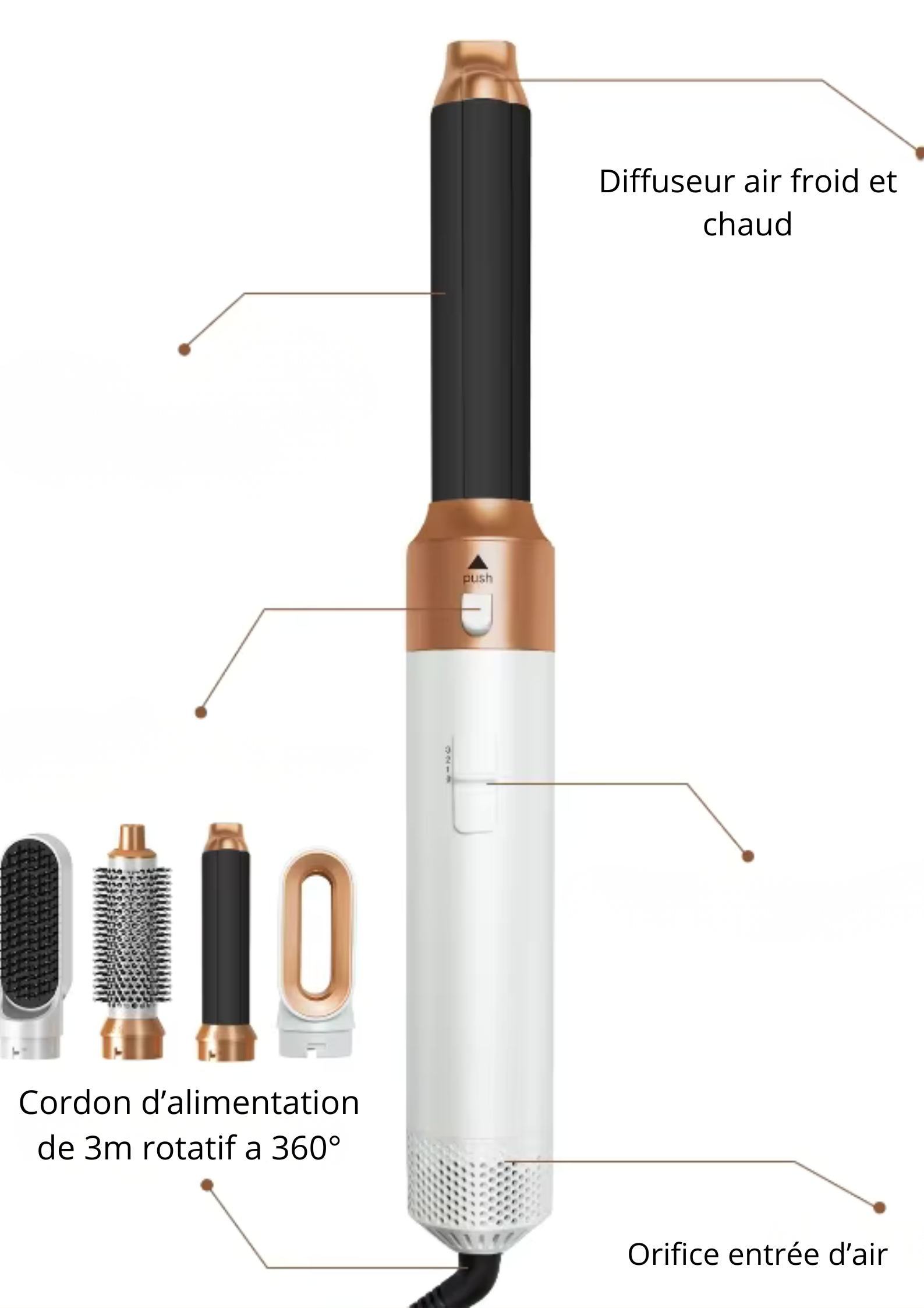 Ses embouts de bouclage utilisent la puissance de l’air pour enrouler automatiquement les mèches, tandis que des instructions claires accompagnent chaque accessoire.